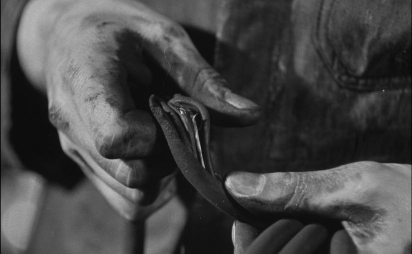 Industrial Accidents by Electricity (Úrazy elektřinou v průmyslu, 1950), on the other hand, serves as a warning and has a deterrent purpose. The film was commissioned by the Czechoslovak Labour Institute, which supplied Vláčil with the topic and subsequently interfered with the script. The protagonist is an impartial narrator, and the director adjusts the scenes to the narration. We cannot hear the voices of the people on the screen, and the film evokes the reading of a security manual. The film’s opening scene depicts a monumentally shot power plant and electric lines. By using a distorted camera angle, the electric current is shown as a useful force – bot one that can become dangerous when not used carefully. The film goes on to show a variety of cases when workers disregard safety protocols while working with electric current, whether it powers a machine, a socket or a lamp. The images are accompanied by an ironic commentary mocking the careless workers. Vláčil creates sharp contrasts by alternating deterrent examples with illustrative examples of good practice.